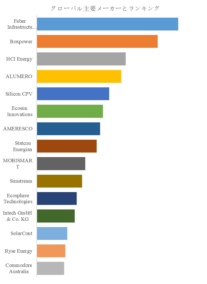QYResearchのトップ企業研究センターによると、コンテナ型太陽光発電所の世界的な主要製造業者には、Faber Infrastructure GmbH、Boxpower、HCI Energy、ALUMERO、Silicon CPV、Ecosun Innovations、Statcon Energiaa、AMERESCO、MOBISMART、Sunstreamなどが含まれている。2024年、世界のトップ10企業は売上の観点から約73.0%の市場シェアを持っていた。