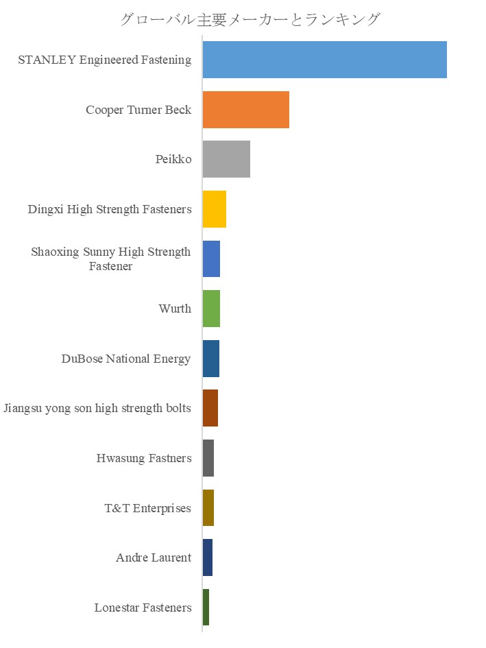 QYResearchのトップ企業研究センターによると、原子力発電用高強度ファスナーの世界的な主要製造業者には、STANLEY Engineered Fastening、Cooper Turner Beck、Peikko、Dingxi High Strength Fasteners、Shaoxing Sunny High Strength Fastener、Wurth、DuBose National Energy、Jiangsu yong son high strength bolts、Hwasung Fastners、T&T Enterprisesなどが含まれている。2024年、世界のトップ5企業は売上の観点から約32.0%の市場シェアを持っていた。